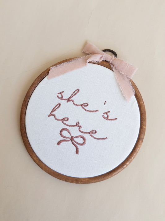 She's Here Embroidered Hoop Sign