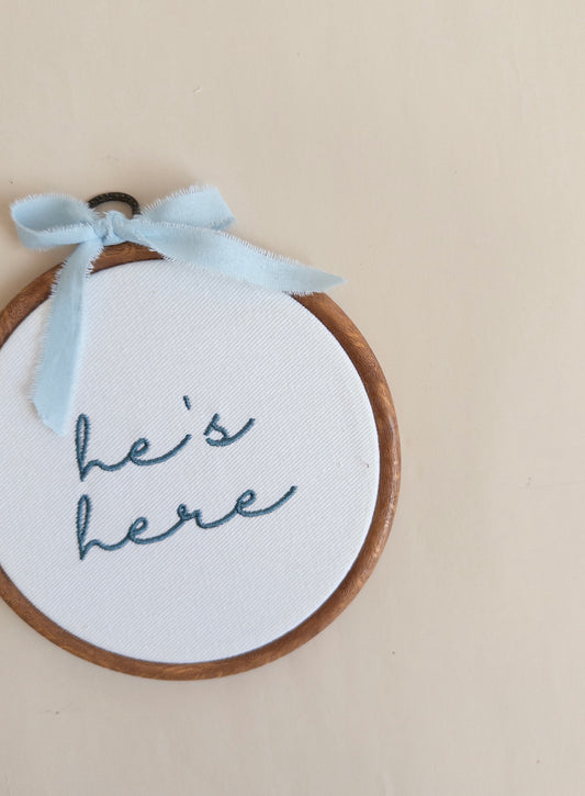 He's Here Embroidered Hoop Sign